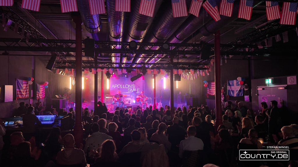 Der Saal im Lindenkeller empfing die Gäste im Stile einer amerikanischen Musik-Bar – dekoriert mit dem Star-Stangled-Banner auf unzähligen Flaggen, Cowboyhüten, US-Wimpeln und vielem mehr. Den musikalischen Auftakt machte das Freisinger Singer-Songwriter-Duo Apollon’s Smile mit Marc Hanow und Julian Hobmeier. Die beiden Gitarristen präsentierten authentische Songs im „Apollons`s Smile Stil“ mit typischen Elementen aus Folk, Country-Folk, Pop, Blues und Rock und dies mit zwei Akustik-Gitarren und zweistimmigem Gesang. Zum Abschluss ihres Sets wurde der Dire Straits Klassiker „Brothers in Arms“ in einer stimmungsvollen Version gespielt.